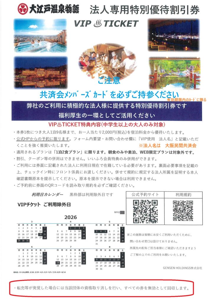 事務局NEWS 大江戸温泉物語 特別優待割引券 有効期限:2026年8月31日 2026年2月19日 kyosaikai VIP TICKETをご利用の方は、共済会までご依頼ください。施設宛でご郵送いたします。有効期間:2026年3月1日~2026年8月31日の宿泊※宿泊者の中に共済会会員本人が含まれている場合にのみご利用いただけます。 宿泊の精算時、VIP TICKETと共済会メンバーズカードの提示が必要です。※フリマサイト等での転売は禁止しています。今後もご案内できるようにルールをお守りください。
